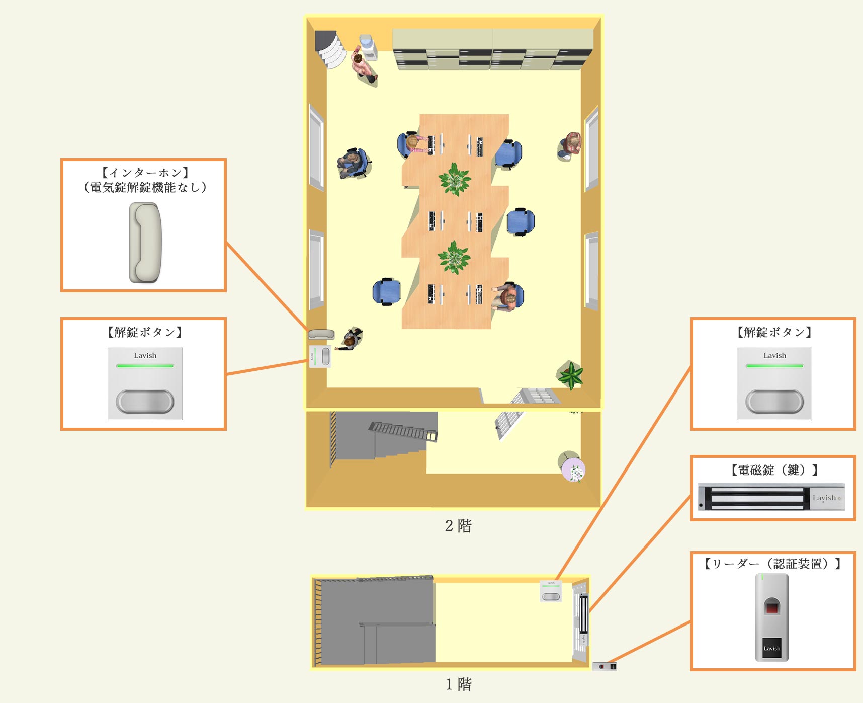 扉の外側にリーダー、内側に解錠ボタン、インターホンの隣にも解錠ボタンを設置し施解錠状態を表示